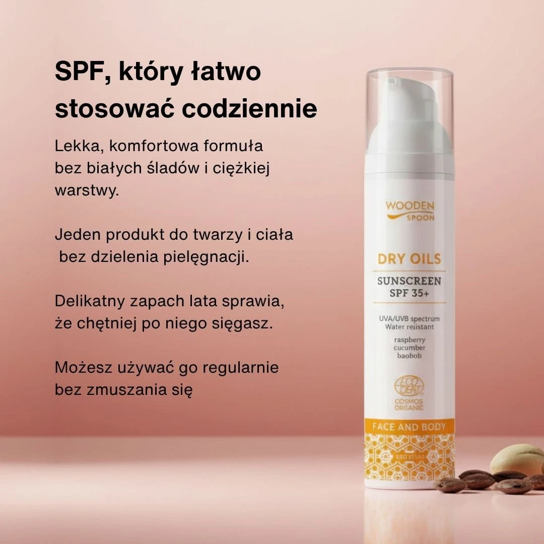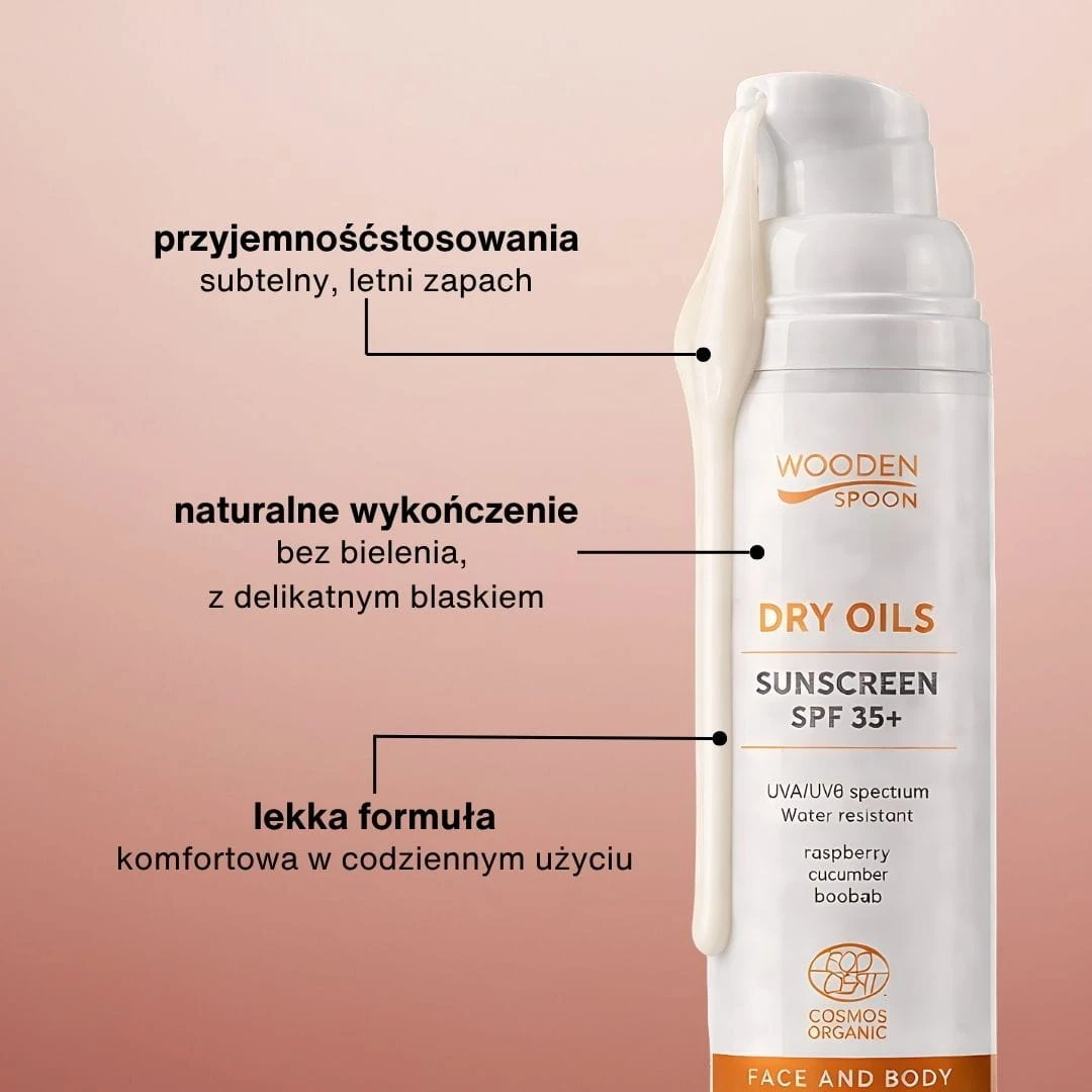 Wooden Spoon SPF 35+ Dry Oils to mineralny krem przeciwsłoneczny do twarzy i ciała, który łączy ochronę z lekkim, komfortowym wykończeniem i pielęgnującą formułą.