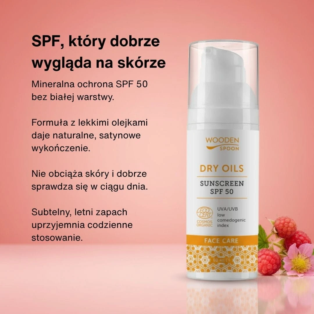Wooden Spoon SPF 50 Dry Oils to mineralny krem przeciwsłoneczny do twarzy, który łączy ochronę z naturalnym wykończeniem skóry – takim, które wygląda dobrze w świetle dziennym.