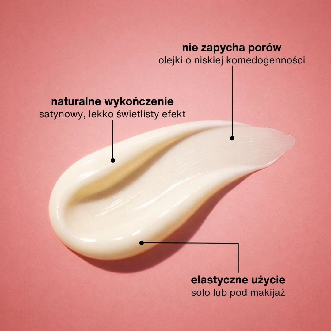 Formuła oparta na lekkich olejkach o niskim potencjale zapychania daje satynowe, lekko świetliste wykończenie i komfort noszenia w ciągu dnia.